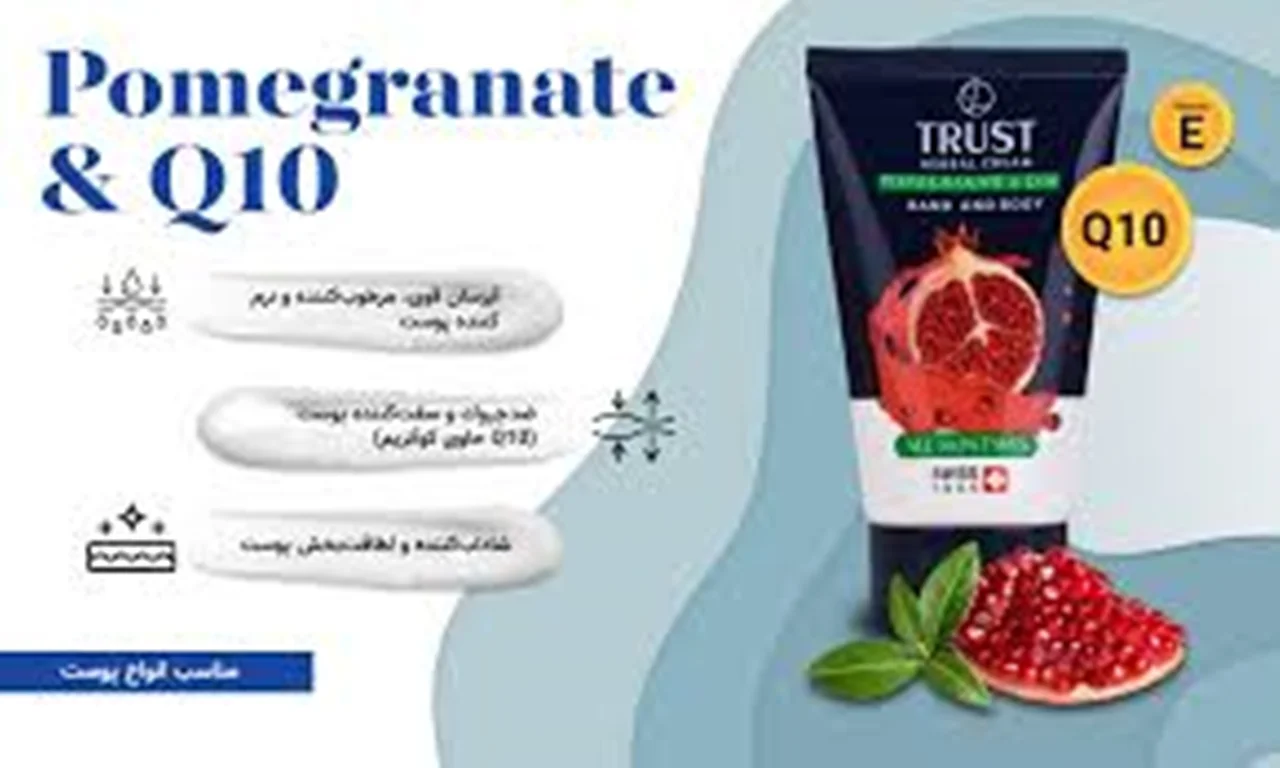 Q10 به کار رفته در کرم انار و Q10 تراست، با تحریک سنتز کلاژن، اثر جوانسازی (سفت کنندگی) بر پوست شما دارد. همچنین این کرم با بهرهگیری از اثر آنتی اکسیدانی منحصر به فرد عصاره انار موجب مهار رادیکالهای آزاد محیطی و ایجاد یک سد دفاعی بر روی پوست میشود. به دلیل خواص بینظیر Q10، طراحی این محصول به گونهای صورت گرفته است که همه افراد با هر نوع پوستی بتوانند از این محصول استفاده کنند. این محصول به عنوان سدی در برابر تبخیر آب پوستی عمل میکند که موجب جلوگیری از خشکی پوست میشود. کرم انار و Q10 تراست، همچنین برای کاهش اثرات اگزمای پوست بدن نیز پیشنهاد میشود.